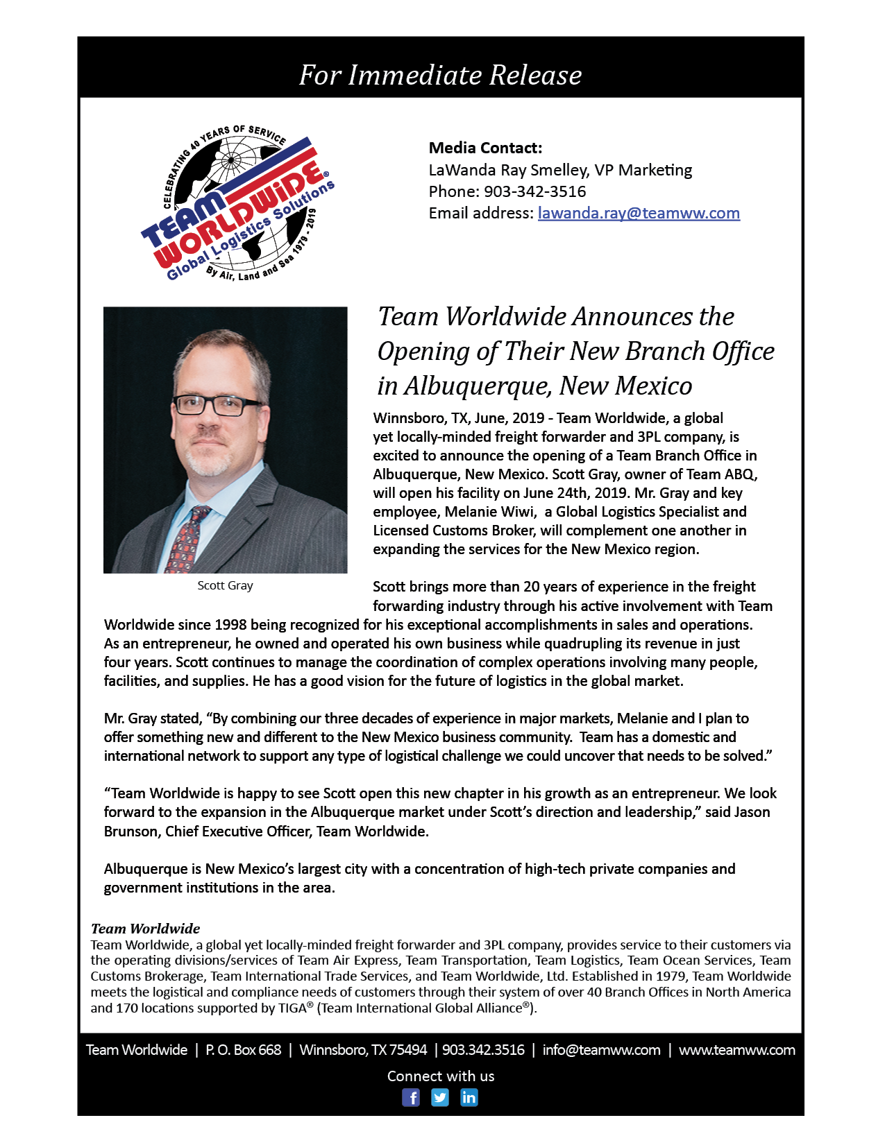 Team Worldwide, a global yet locally-minded freight forwarder and 3PL company, is excited to announce the opening of a Team Branch Office in Albuquerque, New Mexico. Scott Gray, owner of Team ABQ, will open his facility on June 24th, 2019. Mr. Gray and key employee, Melanie Wiwi, a Global Logistics Specialist and Licensed Customs Broker, will complement one another in expanding the services for the New Mexico region.
